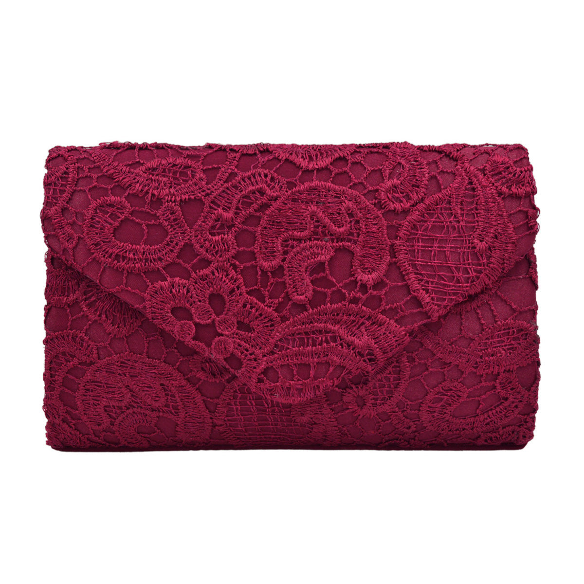 Lace Paisley Floral Fabric Satin Envelope Flap Clutch Evening Bag. This premium quality satin evening clutch is both chic and stylish. Unique and pretty paisley floral lace fabric embroidered front. Fully lined with magnetic-flap closure and inner wall pocket. Removable hideaway shoulder chain strap with 21" drop. Stunning, functional and versatile. The size is 9" (L) x 2.5" (H) x 2.25" (W). Elegant design with understated luxury. Perfect for both day and night use.